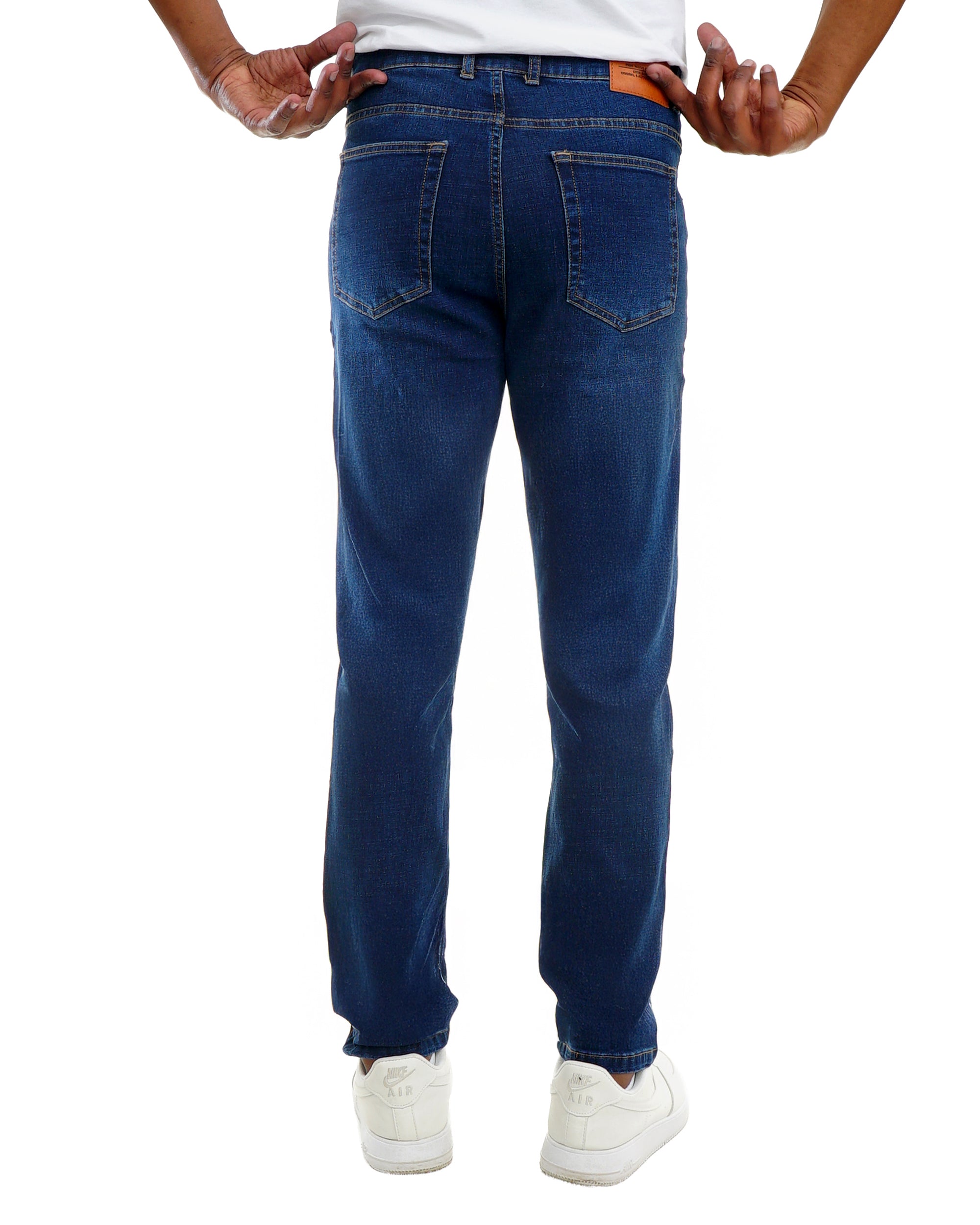 Men’s dark blue jeans with a clean solid wash, perfect for casual, smart casual and everyday wear.