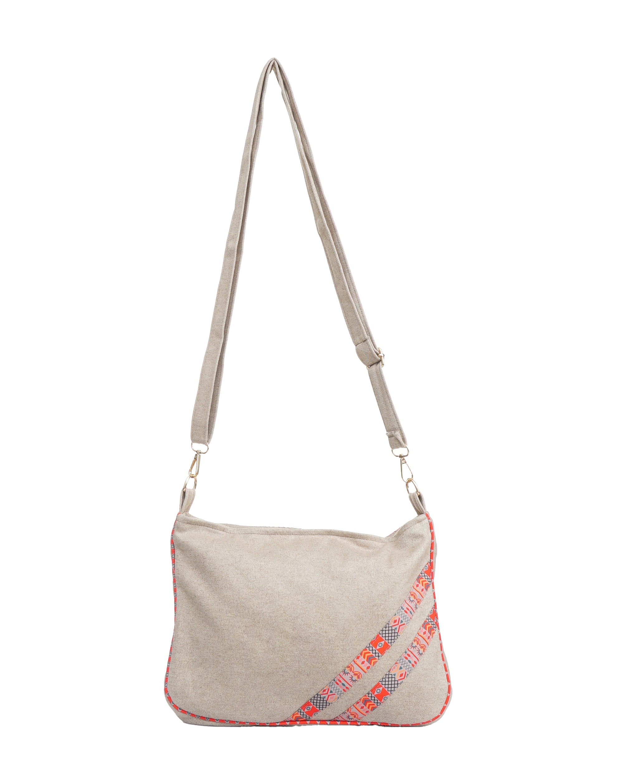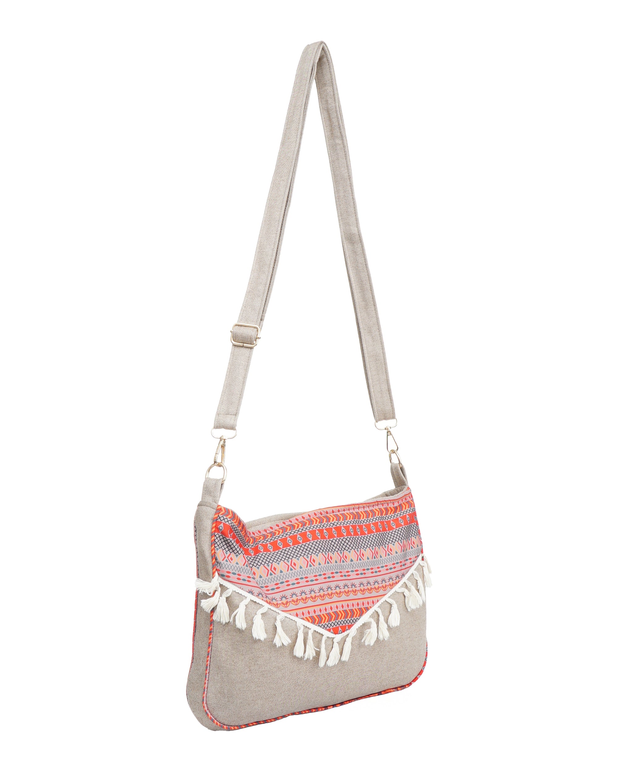 Stylish crossbody bag featuring a boho ethnic pattern with decorative tassels and a soft fabric body. Perfect for casual outings, daily use and adding a trendy touch to any outfit.